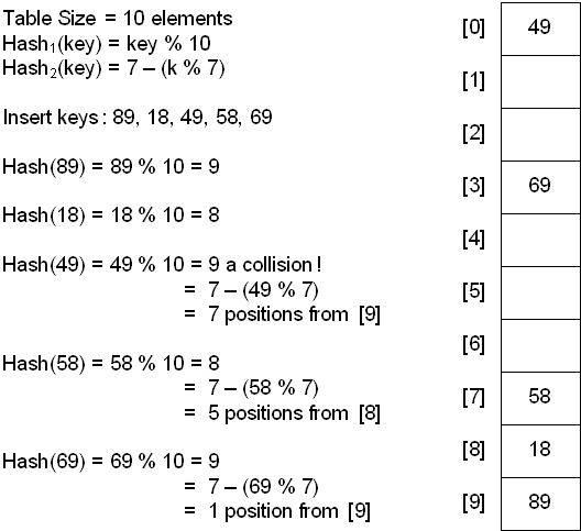 Double hashing uses the idea of applying a second hash function to the key when a collision occurs. The result of the second hash function will be the number of positions from the point of collision to insert.
