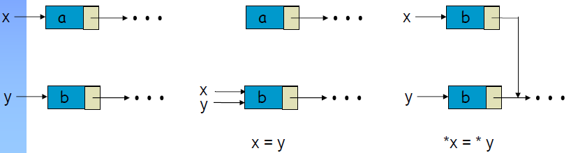 y指到的node的memory address的值assign給x,所以x會指向y所指的memory address。